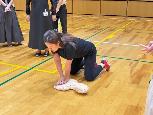 9月29日(月)、教職員を対象とした「AED講習」を実施しました。心肺蘇生法と正しいAEDの使い方について、グループに分かれて行いました。初めて講習を受ける教職員もいましたが、何度か講習を受けたことのある教職員も、改めて講習を受け、救命法を再確認することができました。いざという時のため、AEDがどこにあるのかを把握しておく事の重要性も感じた研修となりました。もしもの際は直ちに救命に当たることができるよう、今後も研修を行い、生徒たちの安全管理に努めてまいります。