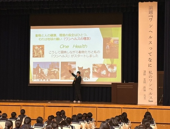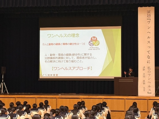 12月10日(水)、福岡県が推進する「人と動物の健康、県境の健全性は一つ」というワンヘルスの考えを広める取り組みの一環として、1年生を対象に教育講演を行いました。